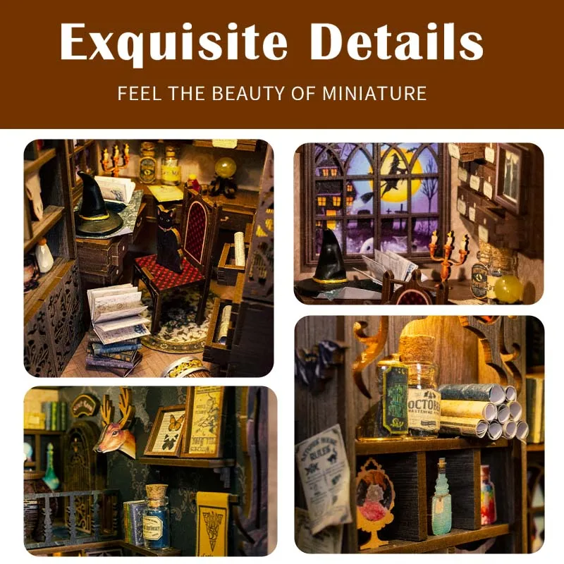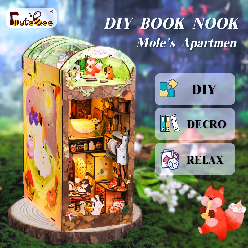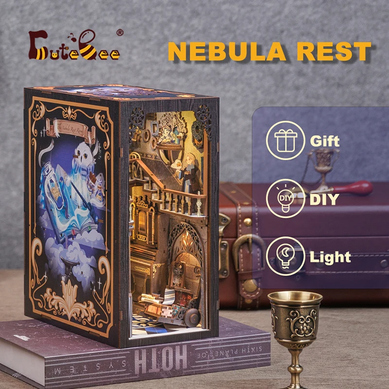 CUTEBEE DIY Gifts Ideas Book Nook Kit Crafts Wooden Doll House Touch Light Elven Paradise Diorama Bookshelf Insert Decor Model