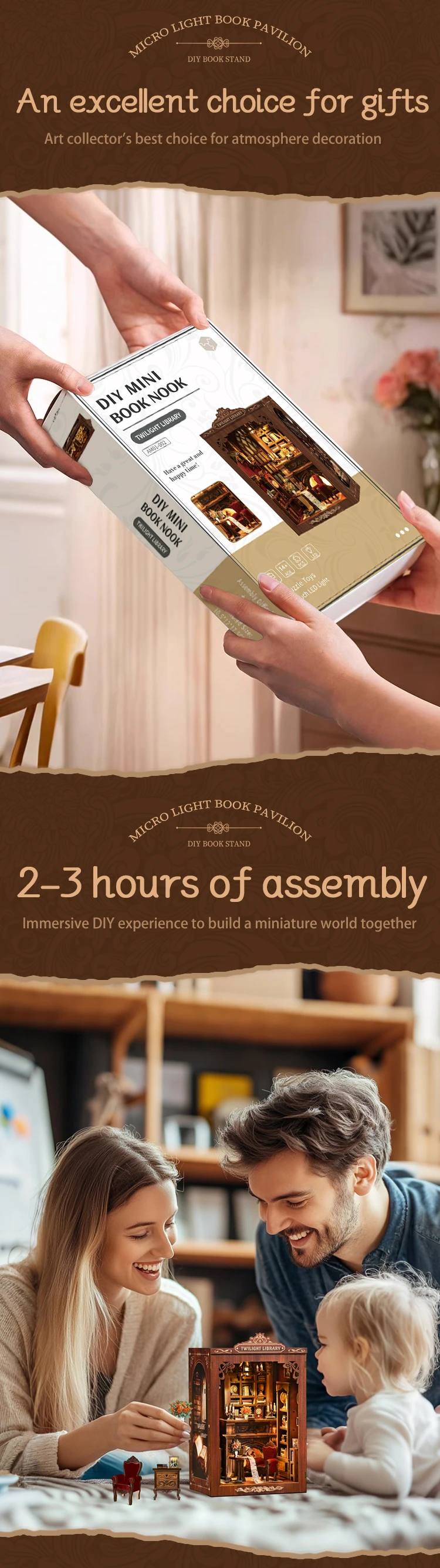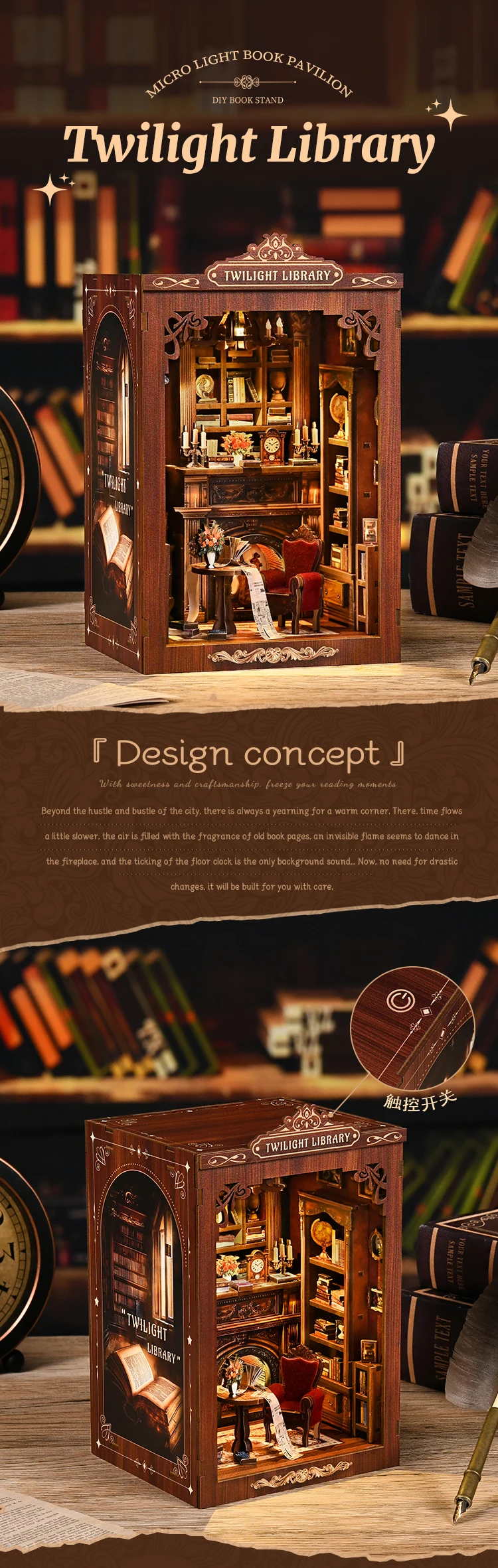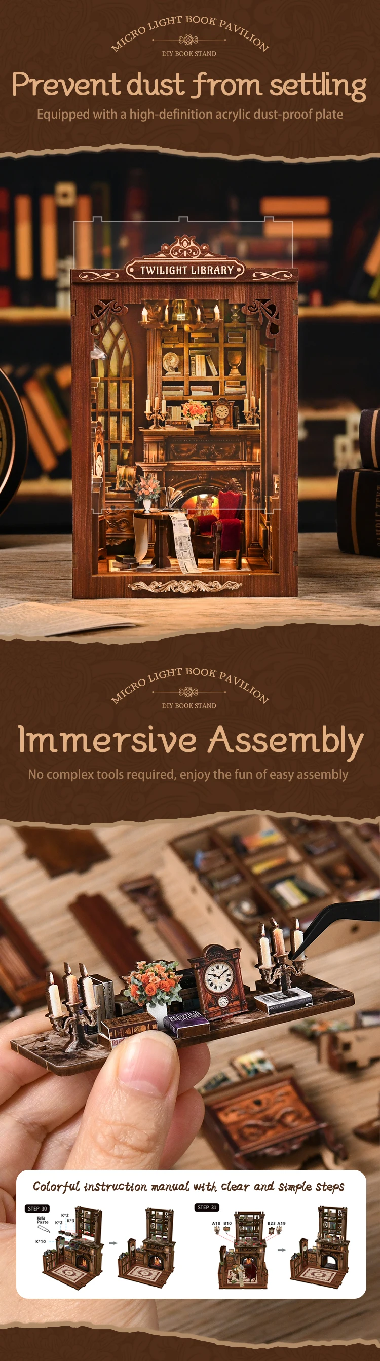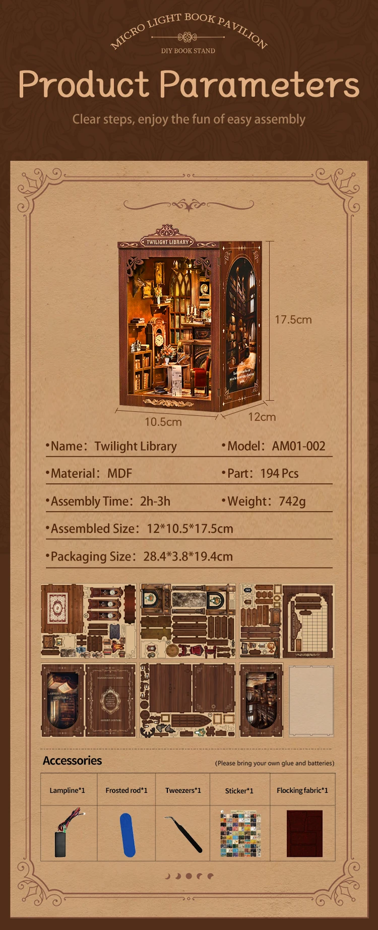 DIY Book Nook Kit - TWILIGHT LIBRARY Wooden Bookend, 3D Puzzle Assembly, Handmade Model for Christmas & Black Friday Gifts