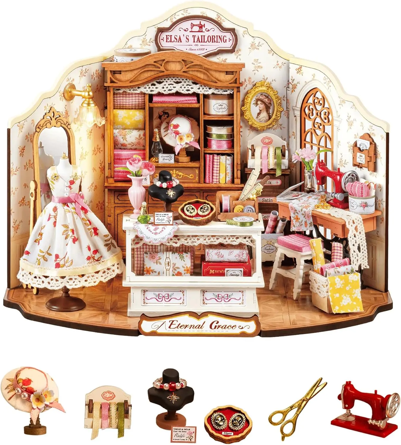Robotime DIY Miniature House Kit Elsa's Tailoring 1:18 Scale Dollhouse Building Kit Antique Bookshelf Display Crafts for Adults
