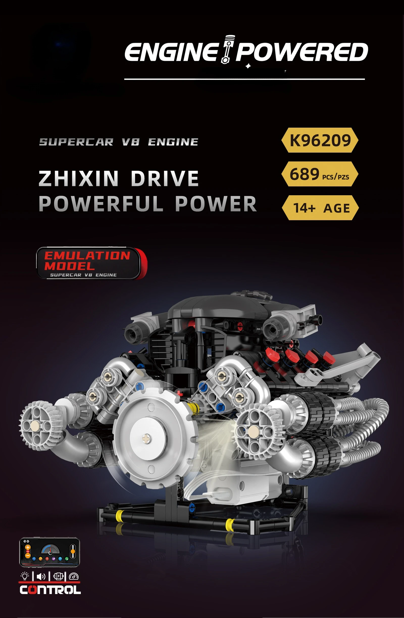 Supercar V8 Engine Technic Parts Block Model 689 Pellet Motor Drive with Light Ambience Perfect Gift for Boys Christmas Birthday