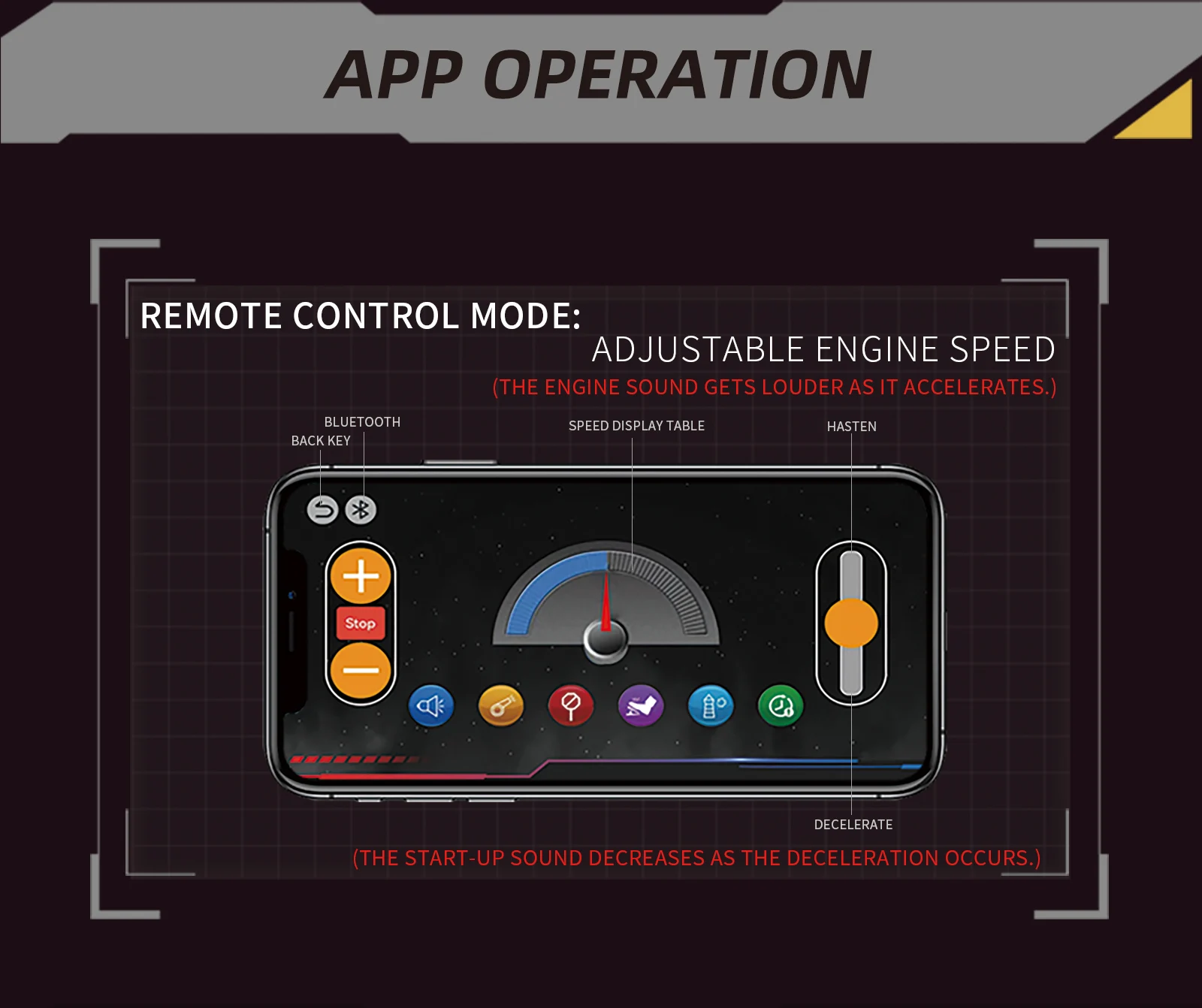 The integrated motor provides running horsepower, and the app controls the large, medium and small horsepower, accompanied by the sound effect of increasing horsepower;