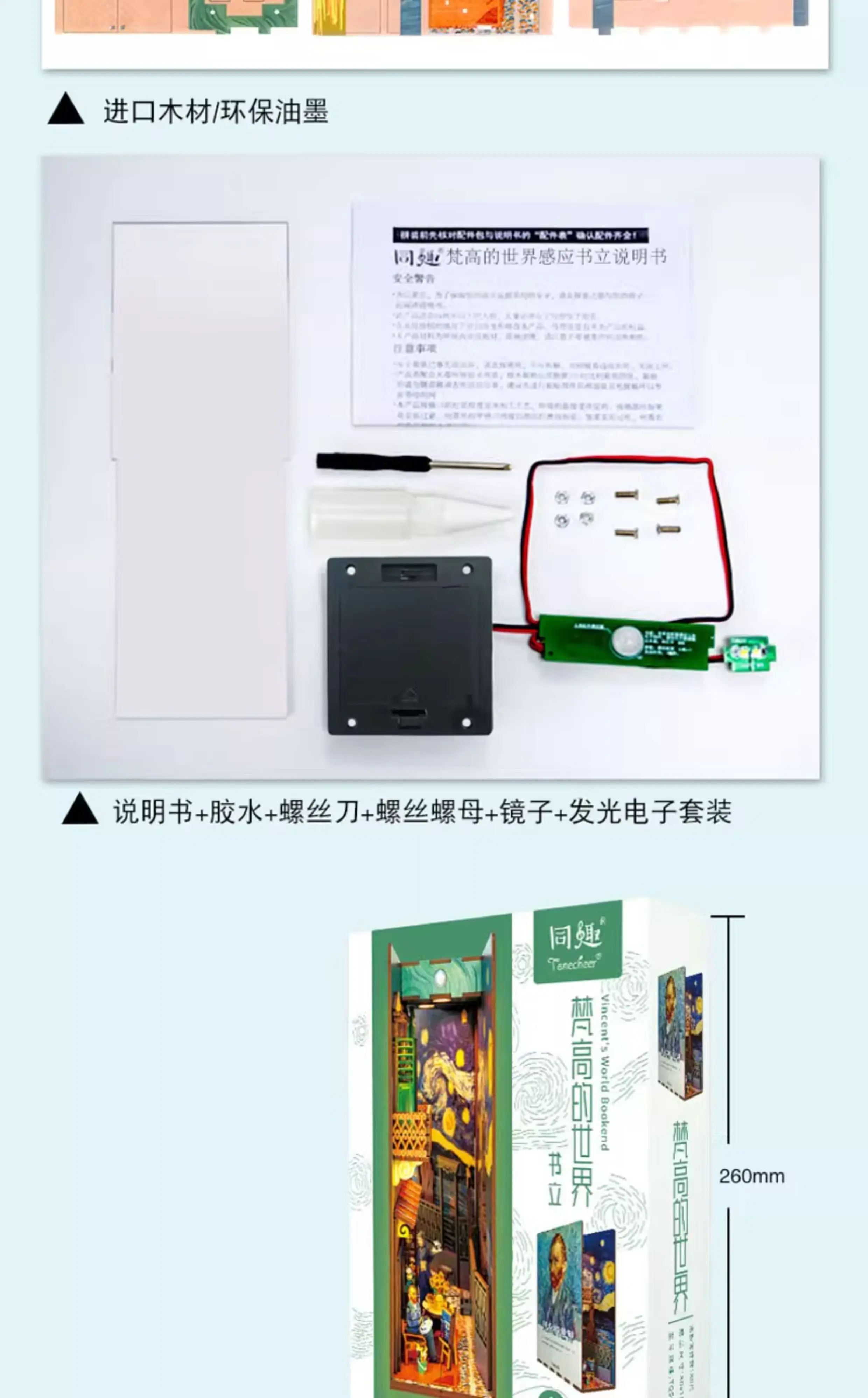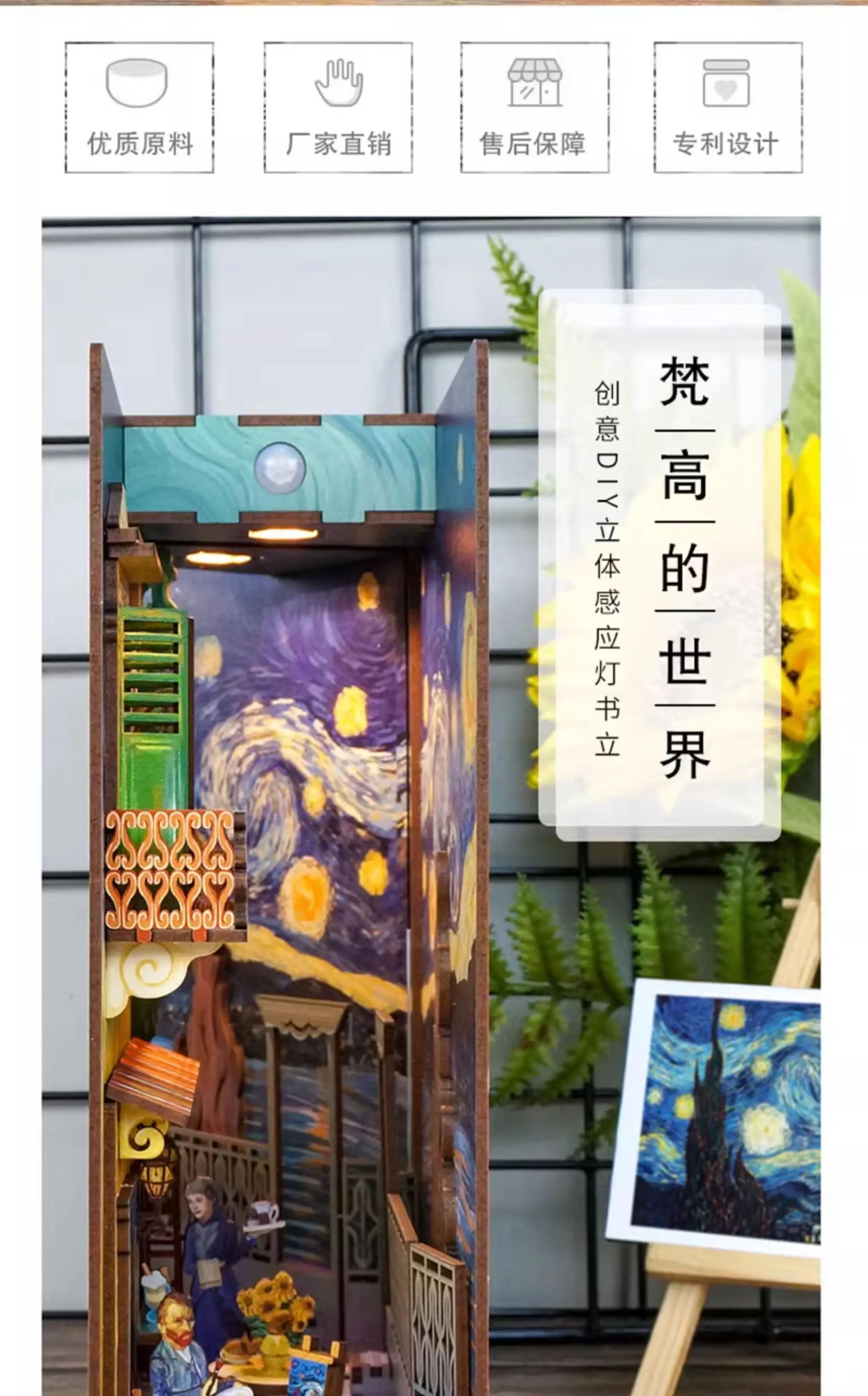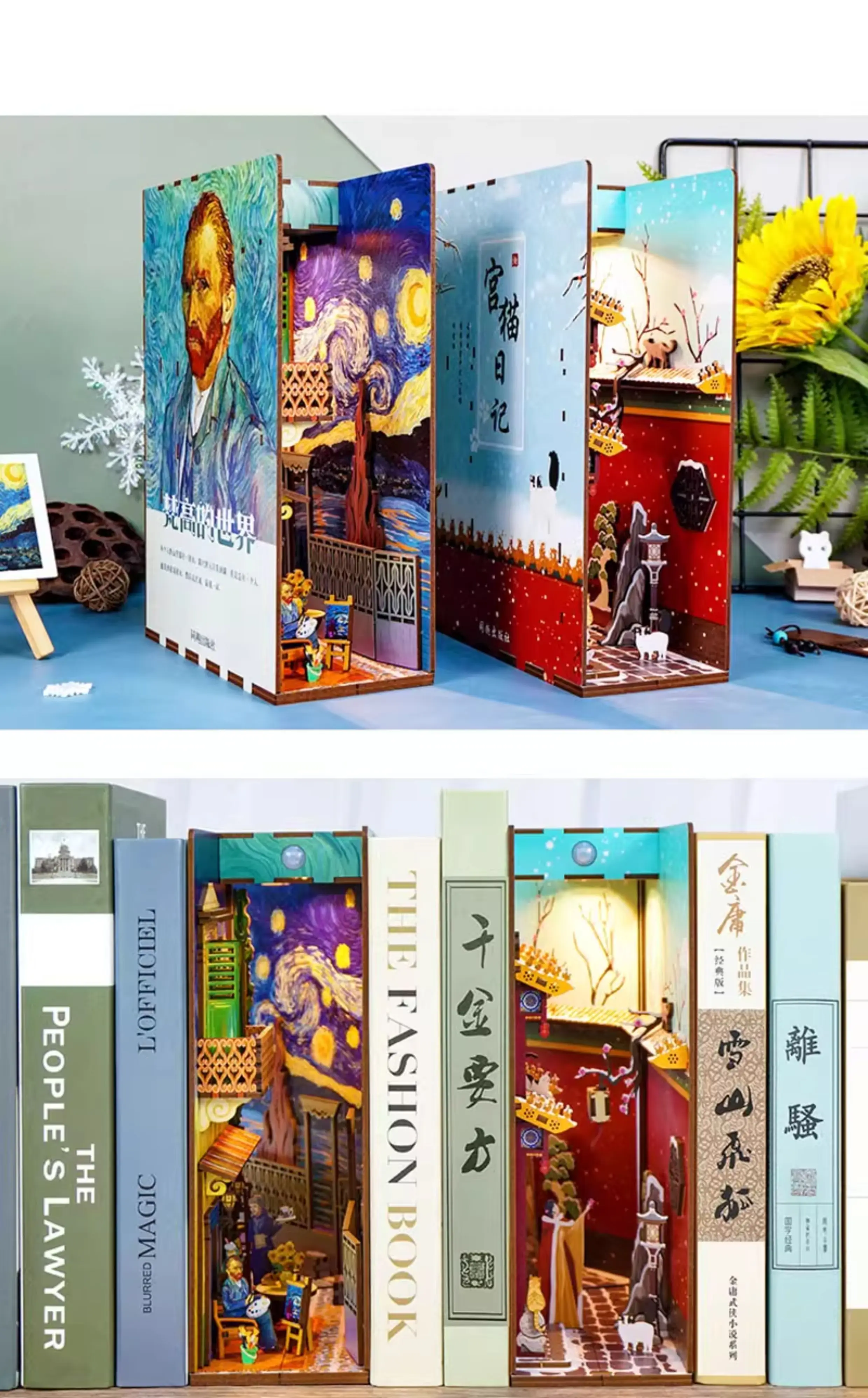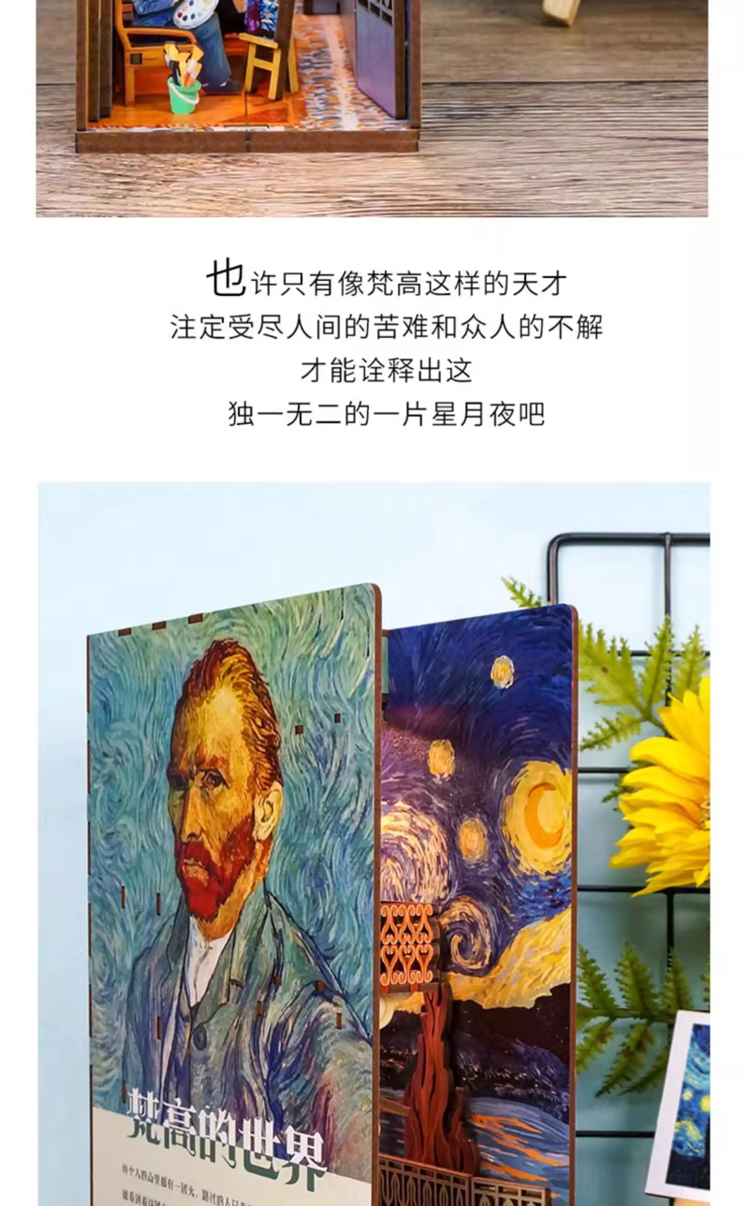Tonecheer Vincent Willem Van Gogh DIY Book Nook Dollhouse Diorama Model Kit 3D Wooden Puzzle Wooden Bookend Decoration Toys Gift